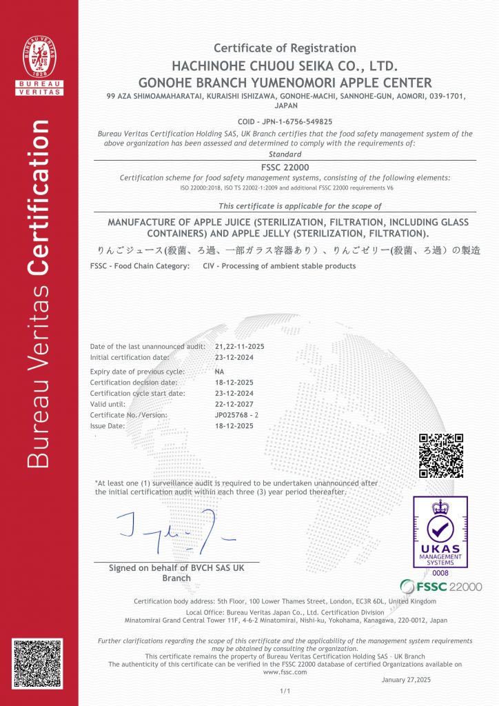 2017年10月、青森県五戸町の倉石地域振興公社より業務を引き継ぎ、「八戸中央青果 五戸支店」として営業を開始いたしました。 現在は主に、青森県産りんごを原料にしたりんごジュースの製造・販売をしています。